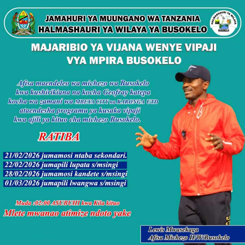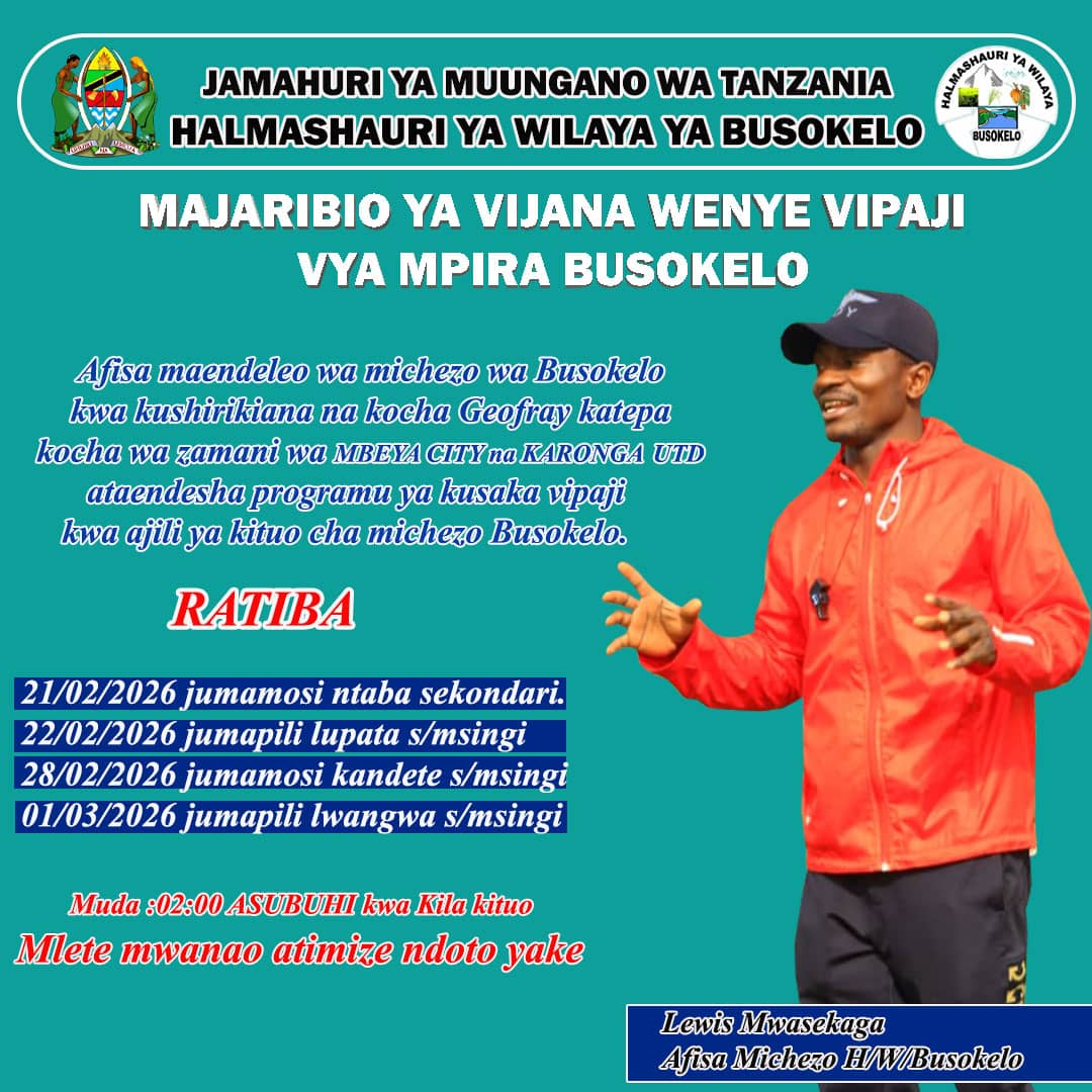 Halmashauri ya Wilaya ya Busokelo inatarajia kuzindua programu ya kusaka na kuibua vipaji vya mpira wa miguu kwa vijana wa wilaya hiyo, ikiwa ni sehemu ya mkakati wa kuimarisha sekta ya michezo na kukuza vipaji vya vijana ngazi ya jamii.